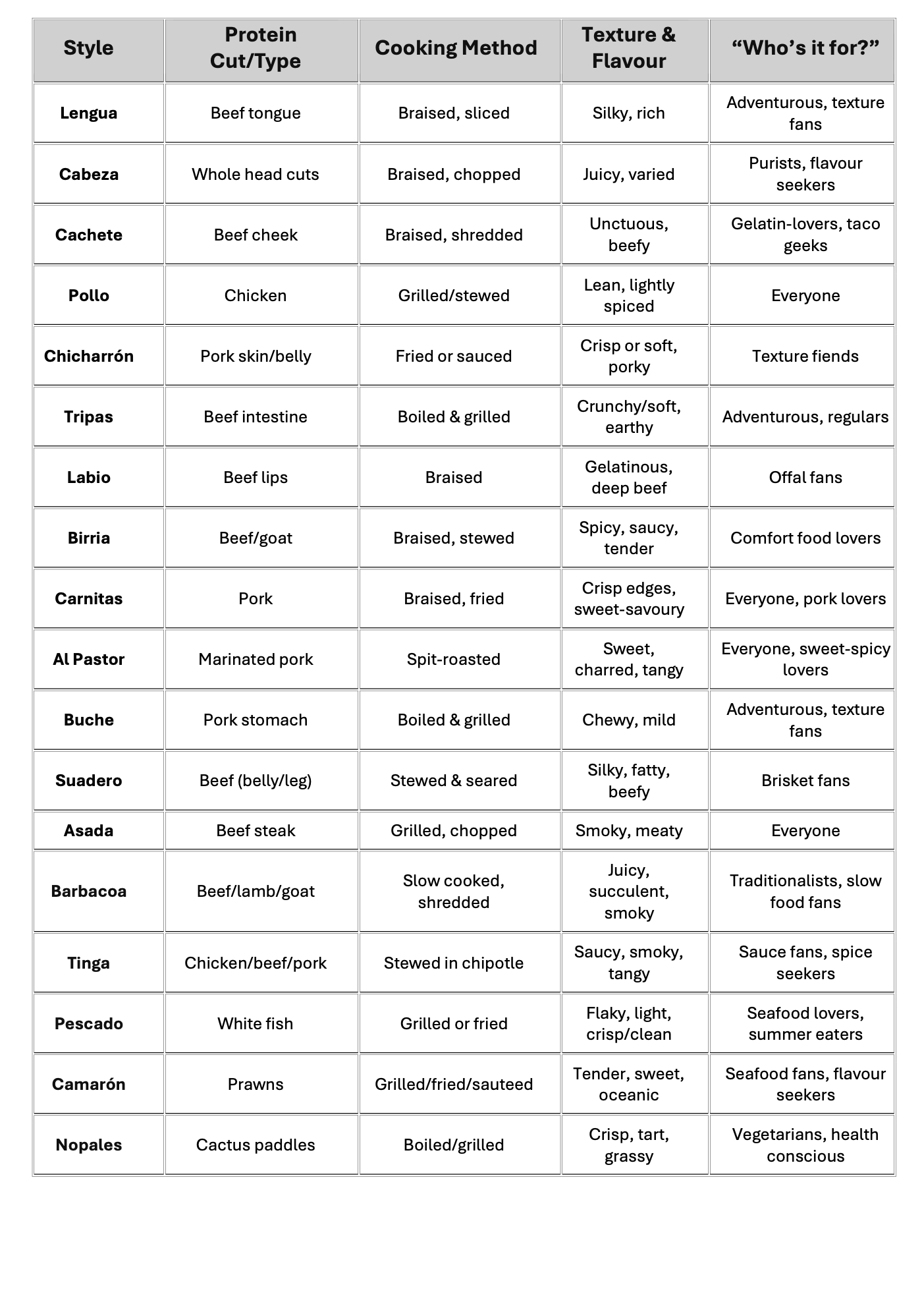 Cabeza A mix of head meats like beef and pig, including cheek and all other bits of the head, each bringing different textures in one filling. Juicy, varied and complex.